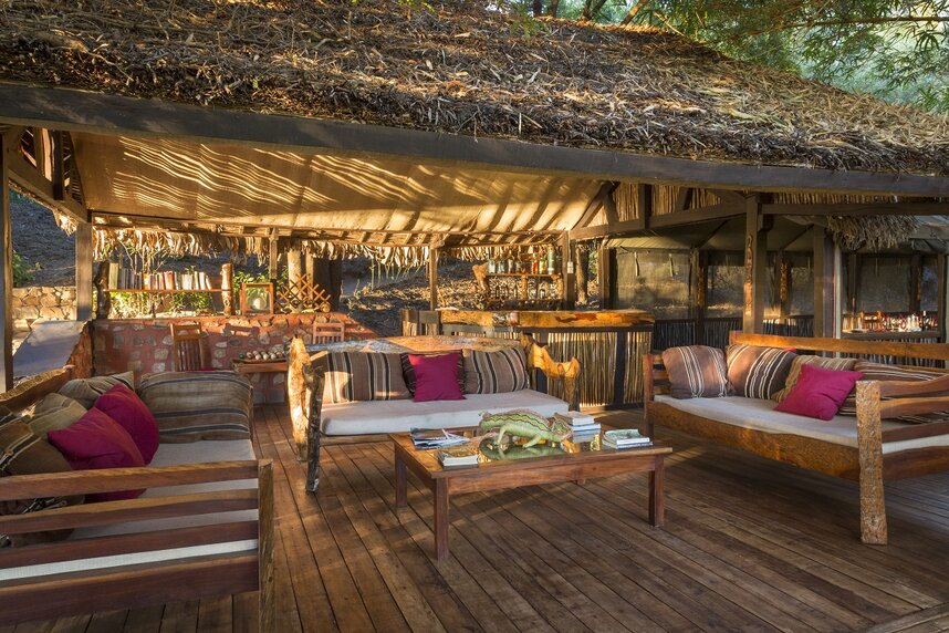 Die sechs Luxus-Zelte liegen unter schattigen Tamarinden verteilt und verfügen über eine komfortable Ausstattung mit handgearbeiteten Holzmöbeln, Himmelbett mit Moskitonetz, Solar Beleuchtung und ein en-suite Badezimmer. Die möblierte Veranda bietet einen fantastischen Ausblick auf die umliegenden Berge und auf den Fluss.