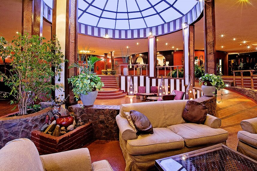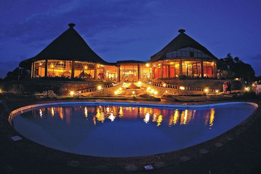 Die beliebte Lodge steht auf dem höchsten Punkt des Kraterrandes und bietet als einzige einen traumhaften Blick auf den Krater bei Sonnenuntergang. Das Haupthaus ist von typisch afrikanischer Rundbauweise inspiriert und mit lokalen Designelementen geschmückt. Das Restaurant ist für bis über 200 Gäste ausgelegt, man speist an kleinen Tischen rund um eine offene Feuerstelle. Die hohen Decken vermitteln ein weitläufiges Ambiente, die Einrichtung besteht aus bequemen Polstermöbeln, Tischen aus dunklem Holz und einer Bar. Vor dem Hauptgebäude erstreckt sich ein Swimmingpool mit ungehinderter Aussicht auf den Krater.