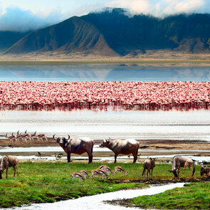 Die Ngorongoro Conservation Area grenzt in ihrer nordwestlichen Ausdehnung an die Serengeti und nördlich an den Ol Doinyo Lengai, den heiligen Gottes-Berg der Massai. Vor Jahrmillionen sankte der gigantische Vulkan in sich zusammen und am Boden der Caldera entstand ein außergewöhnlicher Lebensraum mit weiten Grasebenen, einem Natronsee und üppigen Flussläufen. Hier tummeln sich bis zu 30.000 Wildtiere und man hat das ganze Jahr über außergewöhnlich gute Chancen, die “Big Five“ zu erspähen.
