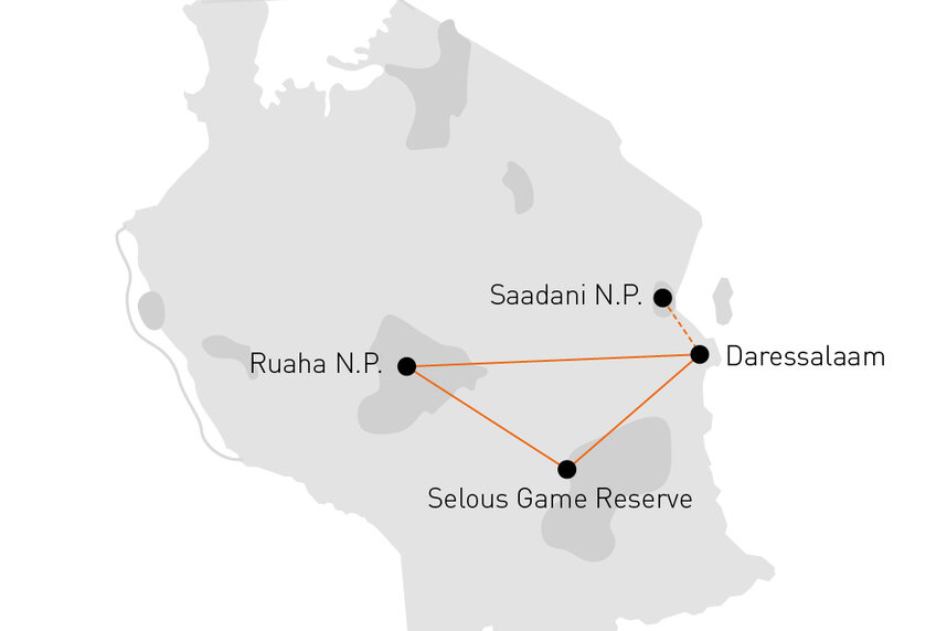Ihre Reise beginnt mit dem Flug von Daressalam zum Selous Game Reserve. Dieses Reservat ist das größte Afrikas und bekannt für seine große Löwenpopulation sowie Wildhunde. Lebensader ist der Rufiji Fluss, der viele Lagunen bildet. Sie haben die Wahl zwischen Bootsausflügen, Walking Safaris und Pirschfahrten.