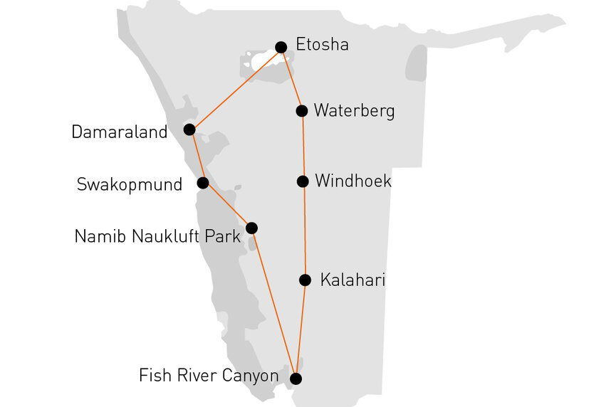 Atemberaubende Wüstenlandschaften der roten Kalahari, die hohen Dünen von Sossusvlei und das reizvolle Damaraland gehören zu den Erlebnissen auf dieser Reise. Höhepunkt ist eine Safari in der Etosha-Pfanne.