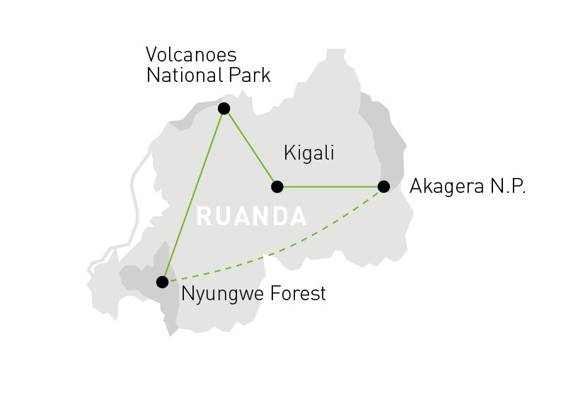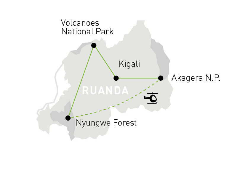 Nach einem reichhaltigen Frühstück fliegen Sie per Helikopter etwa eine Stunde in den Nyungwe Nationalpark. Dieser Regenwald beherbergt eine Vielzahl von Wildtieren, endemischen Vogelarten, Schmetterlingen und über 100 verschiedene Orchideenarten. Die Hauptattraktion sind seine Primaten, denn hier sind über 400 Schimpansen zuhause. Nach einem sehr zeitigen Frühstück machen Sie sich am nächsten Tag auf die Suche nach den Schimpansen. Am Nachmittag unternehmen Sie einen Canopy Walk durch den faszinierenden Dschungel und können das größte noch zusammenhängende Urwaldgebiet in Ruanda erkunden.