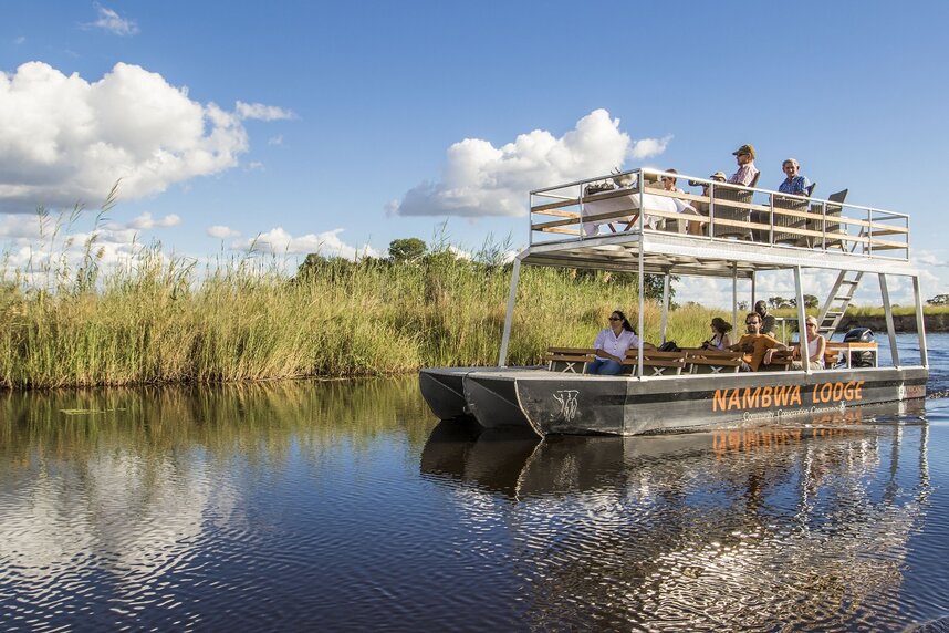 Entlang der östlichen Caprivi Region führt die Reise in die Nambwa Tented Lodge im Herzen des KAZA-Schutzgebietes des Bwabwata Nationalpark. Sie erkunden in Begleitung erfahrener Guides die Pflanzen- und Tierwelt aus nächster Nähe, während Fußwanderungen oder vom Geländewagen aus. Oder Sie paddeln im traditionellen Mokoro entlang der sicheren Wasser- adern des Kwando-Schwemmgebietes. Am Infinity-Pool mit Liegen können Sie herrlich entspannen. Die Mahlzeiten können Sie entweder im oder außerhalb des Restaurants auf dem Aussichtsdeck einnehmen. Von hier bietet sich Ihnen ein wunderbarer Ausblick auf das lodgeeigene Wasserloch sowie die Überflutungsebenen.