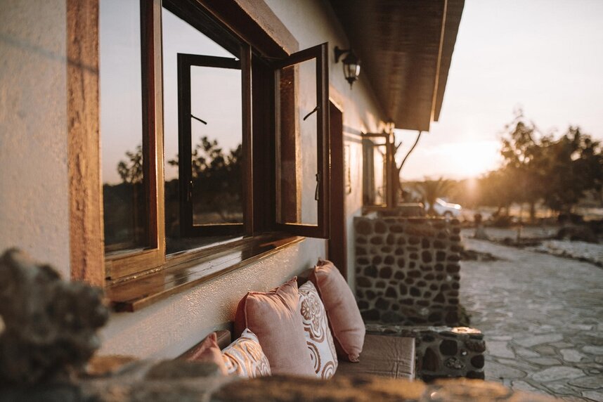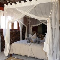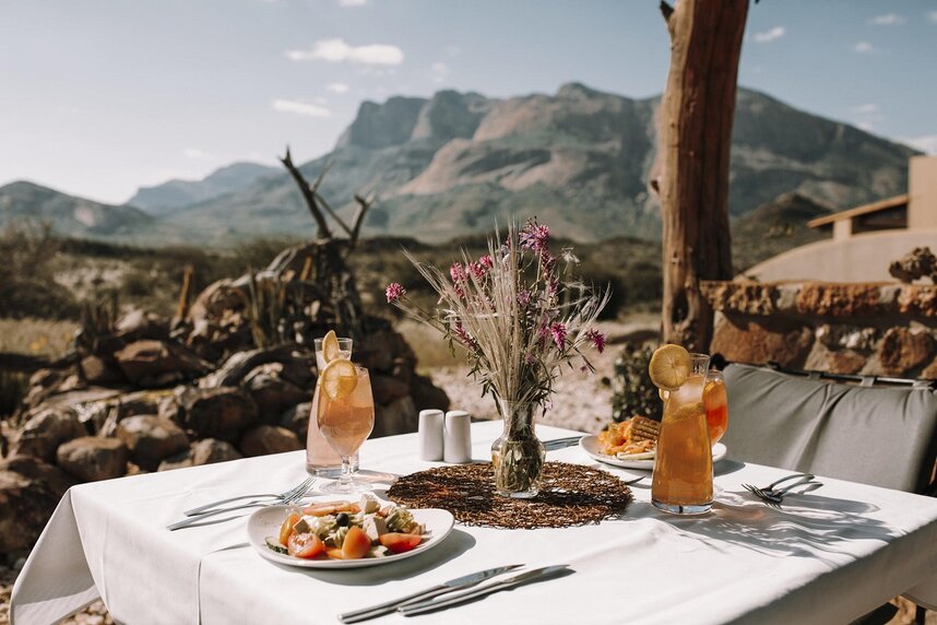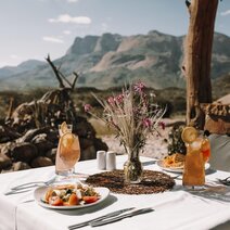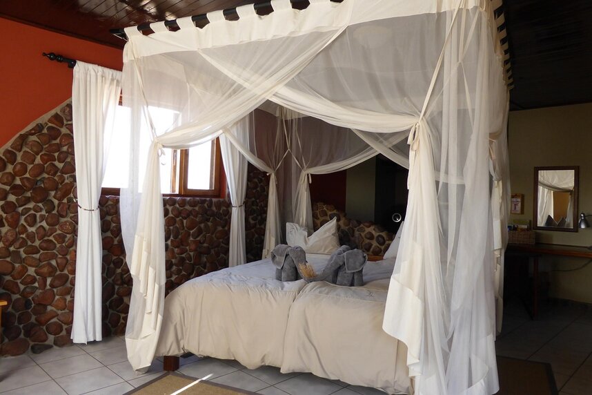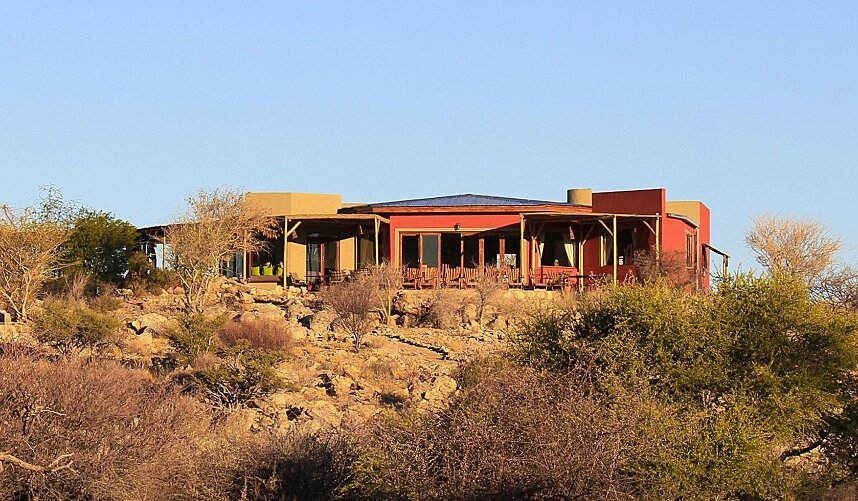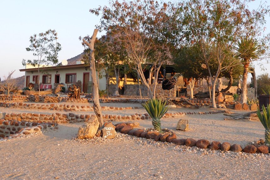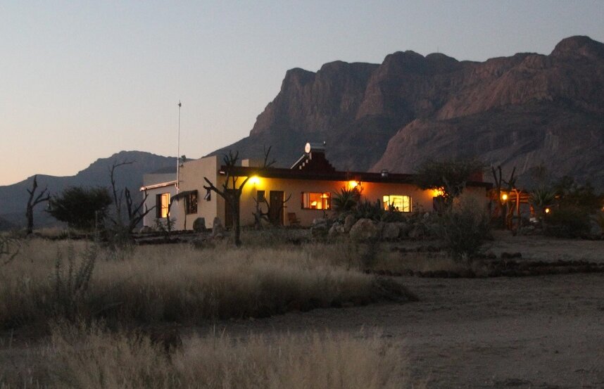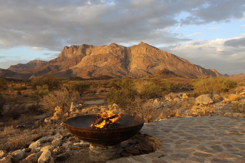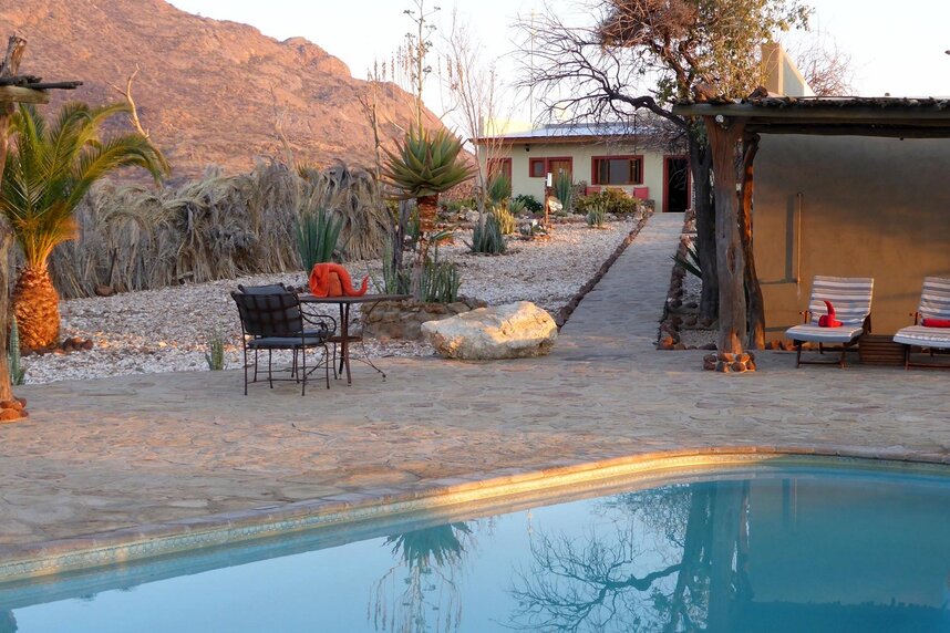 Die gemütliche Lodge liegt am Fuße des höchsten Berges im Erongo Massiv. Der Hohenstein bildet mit einer Höhe von 2.319m den imposanten westlichen Abschluss der Erongoberge. Spektakuläre Sonnenuntergänge über der Wüstenebene lassen den Berg am Abend in traumhaftem roten Licht erscheinen. Vom Swimmingpool mit Sonnenterrasse aus lässt sich der Panoramablick in die Weite der Umgebung genießen, ebenso wie von der Terrasse des Restaurants. Der Blick über die eindrucksvolle Landschaft geht im Westen bis zur berühmten Spitzkoppe, die sich in etwa 30km Entfernung als markantes Relief aus der Ebene erhebt. Im Restaurant können Sie in gemütlicher Atmosphäre im Licht des Kamins Ihr Abendessen zu sich nehmen und bei einem reichhaltigen Frühstück vom Buffet bei gutem Wetter auf der großen Terrasse den neuen Tag begrüßen. Die traumhafte Umgebung lässt sich hier nicht nur zu Fuß, sondern auch mit dem Leihfahrrad der Lodge erkunden.