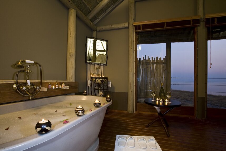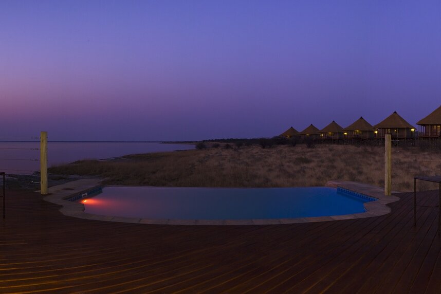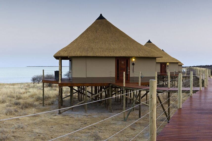 Die 15 Chalets haben Reetdächer und Canvaswände und sind auf erhöhten Plattformen gebaut, die einen weiten Ausblick auf die Pfanne gewähren. Sie sind alle komfortabel mit Dusche, Badewanne, Außendusche und eigener Veranda ausgestattet.