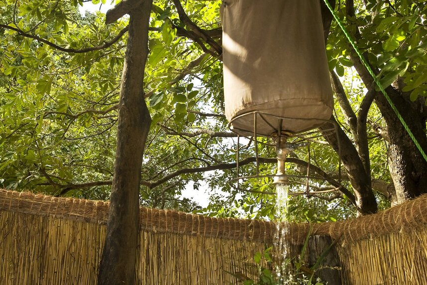 Fünf halboffene Chalets auf Stelzen im rustikalen Design verfügen über ein offenes Bad mit Bucket-Shower, Moskitonetz und Veranda mit traumhafter Aussicht.