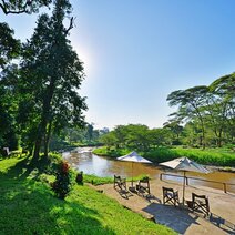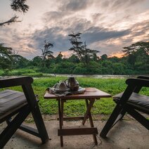 Die zehn geräumigen Meru Zelte liegen oberhalb, zum Teil auch direkt am Flussufer, wo manches Mal auch ein Elefant seinen Durst stillt. Sie verfügen über Busch-Dusche/WC und einen Ankleidebereich. Eine kleine Veranda lädt zum Entspannen und Genießen der Natur ein.