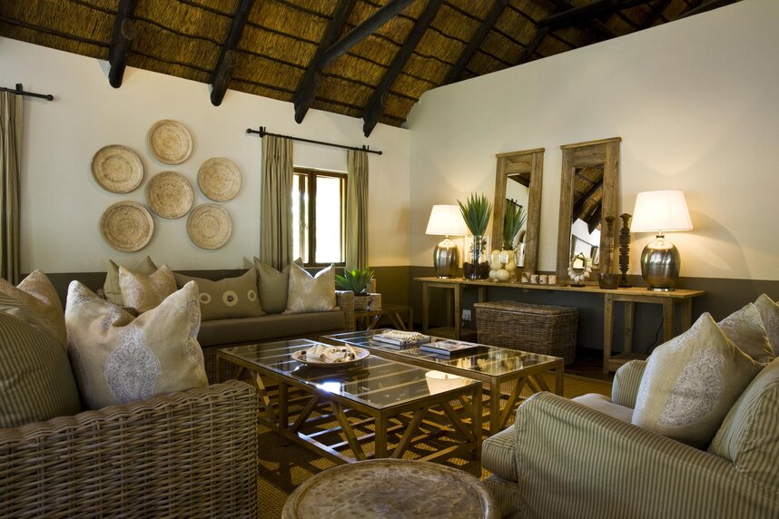 Die Chalets der eleganten Mushara Lodge gruppieren sich hufeisenförmig um einen Pool. Im Haupthaus mit traditioneller afrikanischer Kunst und zeitgenössischen Kunstwerken befinden sich die Bar mit umfangreichem Weinkeller, das Restaurant und die luftige Lounge mit einladendem Kamin und Leseecke. Ein besonderes Merkmal von Mushara ist der große, blau schillernde Swimmingpool, umgeben von einem gepflegten Rasen. Gelegentlich findet sich heimisches Wild am Pool ein.