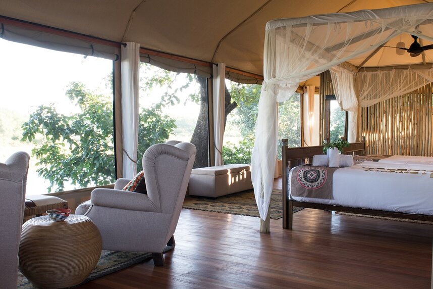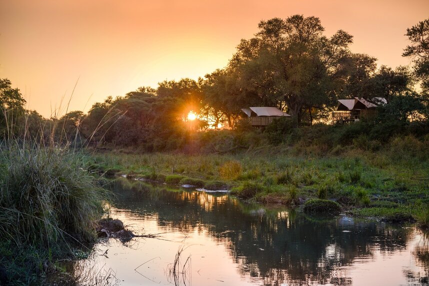 Das Camp verfügt über nur 4 traditionelle Safarizelte, alle mit en-suite Badezimmer, einer geräumigen Sitzecke und einem privaten Außendeck mit Blick auf den Ngwenya Channel. Hölzerne Laufwege verbinden den Hauptbereich mit den einzelnen Safarizelten.