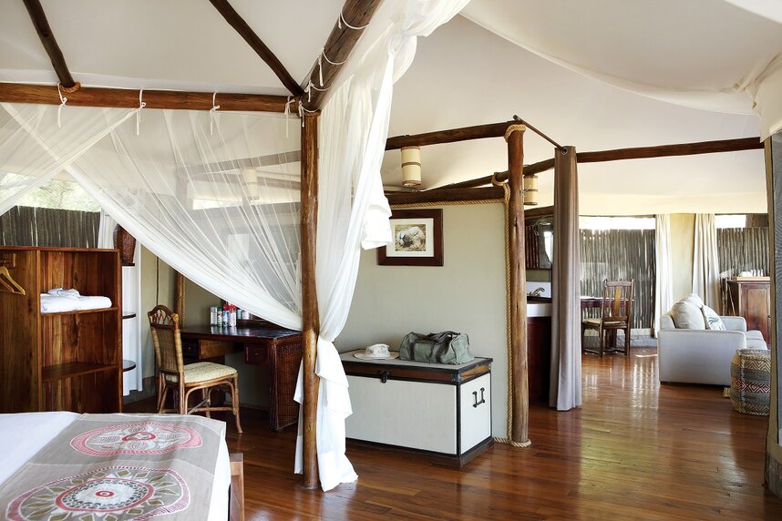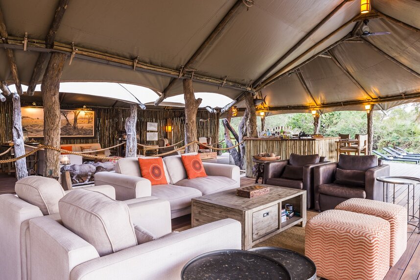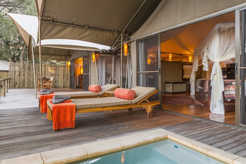 Zum Camp gehören zwölf äußerst geräumige und elegant gestaltete Zelte, die mit einigem Abstand entlang des Flusses errichtet wurden. Sie liegen leicht erhöht auf hölzernen Plattformen und verfügen über Innen- und Außendusche und eine gemütliche Sitzecke. Große Glastüren öffnen sich zum prviaten Aussichtsdeck mit eigenem Pool. Besonders geeignet für Familien ist die Family Suite mit zwei Zimmern, welche über ein Deck verbunden sind.