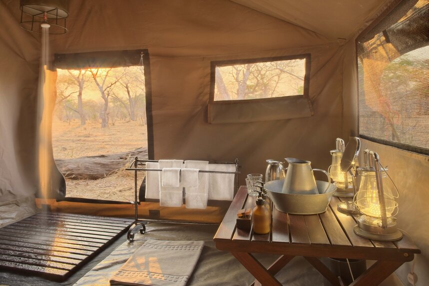 Die Under Canvas Camps bestehen aus je fünf geräumigen Zelten mit Stehhöhe, en-suite Badezimmer, warmer Kübel-Dusche und WC mit Spülung sowie zwei getrennten Betten oder Doppelbett.