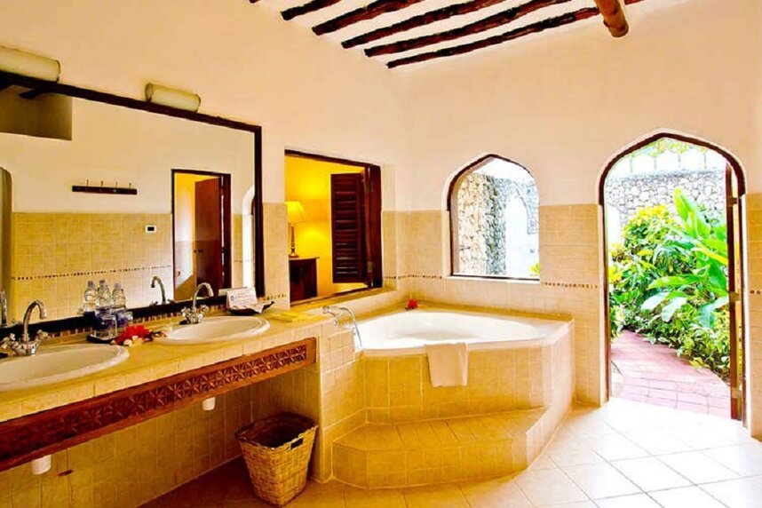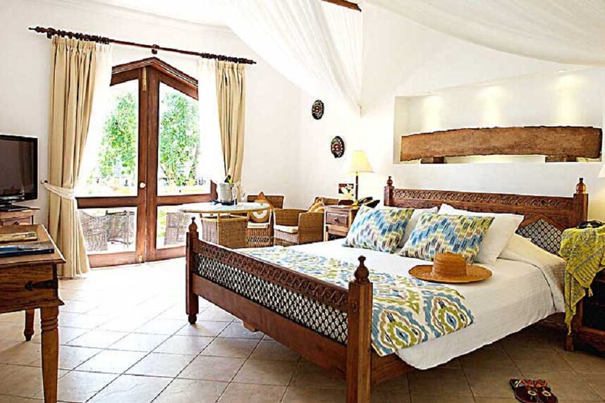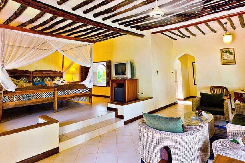 Alle 112 klimatisierten Zimmer sind mit sansibarischen Stilelementen dekoriert und verfügen über Deckenventilator, TV, Minibar, Safe, Bad, Balkon oder Terrasse.