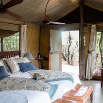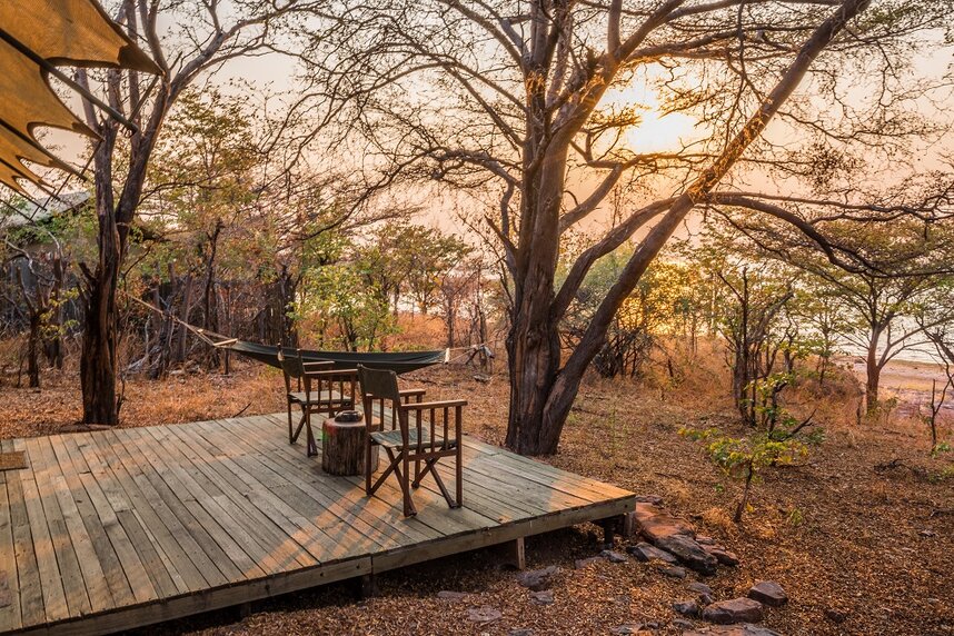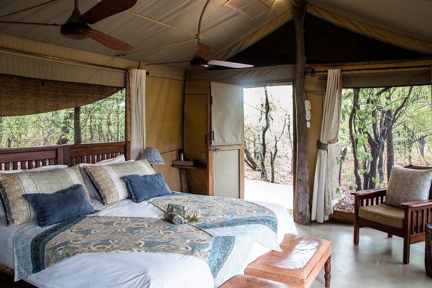 Im Schatten von Mopane Wäldern liegen acht geräumige Zeltsuiten im afrikanischen Stil mit en-suite Bad und Hängematte auf der Veranda. Jedes Zelt hat seinen eigenen, individuellen Charme und ist sehr offen und groß gestaltet.