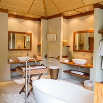 Sie wohnen in 25 geräumigen Zimmern. Die drei Beach Cottages (ca. 90 qm) liegen in Strandnähe inmitten der tropischen Vegetation. Sie verfügen über ein offenes Bad mit Badewanne/Dusche und separatem WC, Telefon, iPod-Anschluss, Klimaanlage, Deckenventilator, Minikühlschrank, Kaffee-/Teezubereiter sowie einen kleinen privaten Garten mit Außendusche und Terrasse zur Meerseite. Die zehn noch großzügiger gestalteten Deluxe Beach Cottages (ca. 130 qm) bieten zusätzlich ein großes Sonnendeck sowie ein Ruhebett zur Meerseite. Darüber hinaus offeriert das Resort zehn Beach Front Spa-Cottages (150 qm) direkt am Strand mit einem Massage-Pavillon. Ideal für Familien sind das Family Cottage (169 qm) und die Beach Villa (325 qm) mit eigenem Pool.