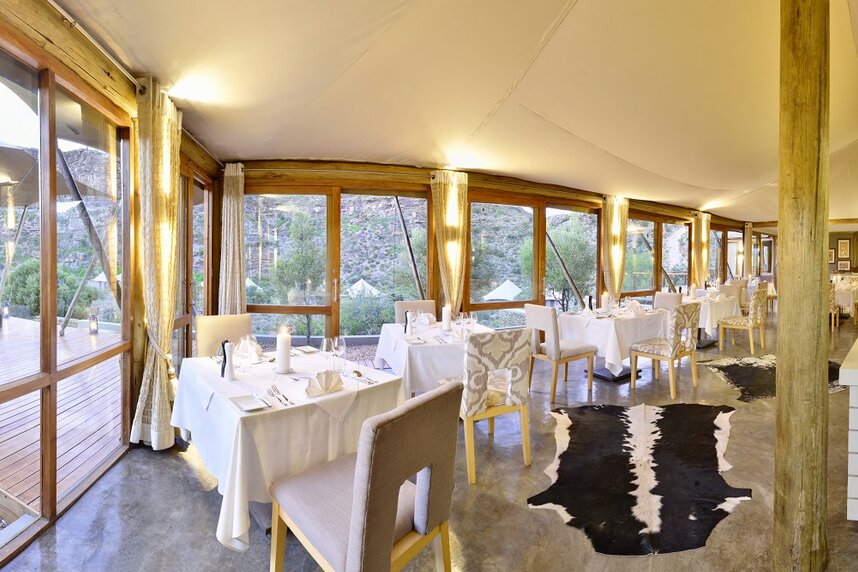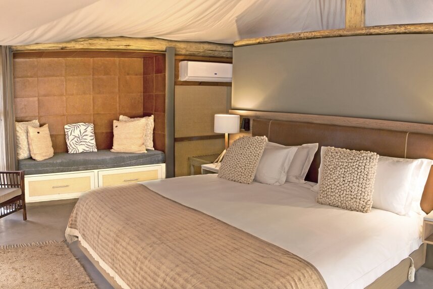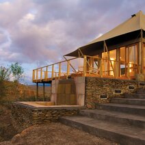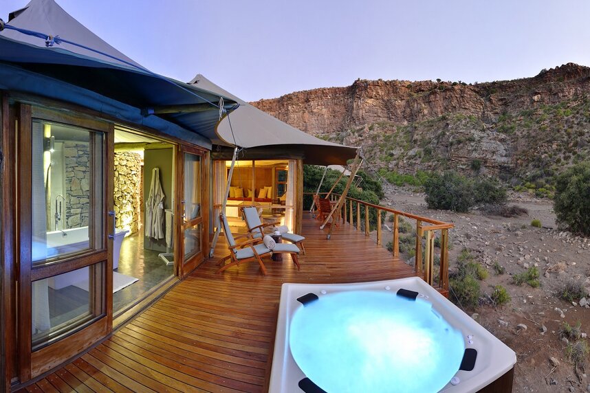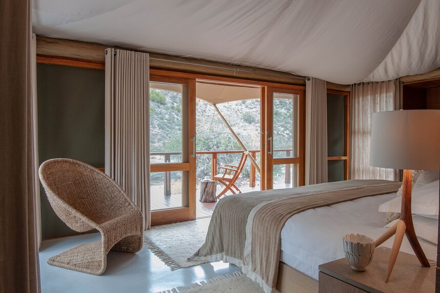 Sie übernachten in einer von neun luxuriösen Zeltsuiten, die jeweils über eine Innen- und Außendusche, En-suite-Badezimmer, Veranda, Minibar, privaten Erfrischungspool, Fußbodenheizung, Telefon, elektronischen Safe, Föhn und internationale Steckdosenadapter verfügen. Durch die Gestaltung der Wohneinheiten als Zelte spiegelt sich trotz der luxuriösen Einrichtung die Atmosphäre ehemaliger Pioniere wider, die einst durch die Weiten dieser unermesslichen Landschaft zogen.