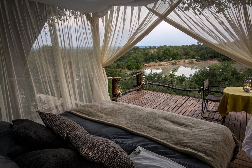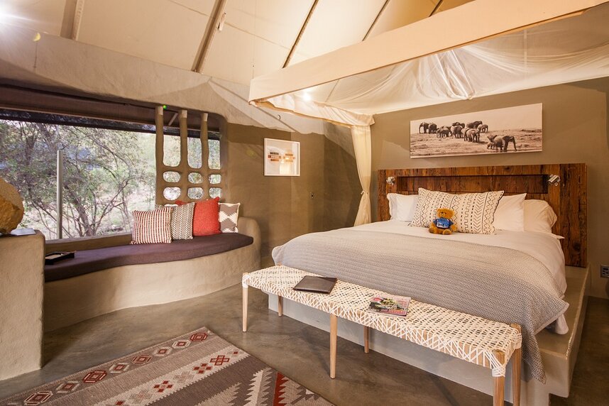 Die sechs Zelt-Chalets liegen unter Ebenholzbäumen und verfügen alle über ein privates Deck mit Aussicht auf ein trockenes Flussbett, sowie ein en-suite-Badezimmer.