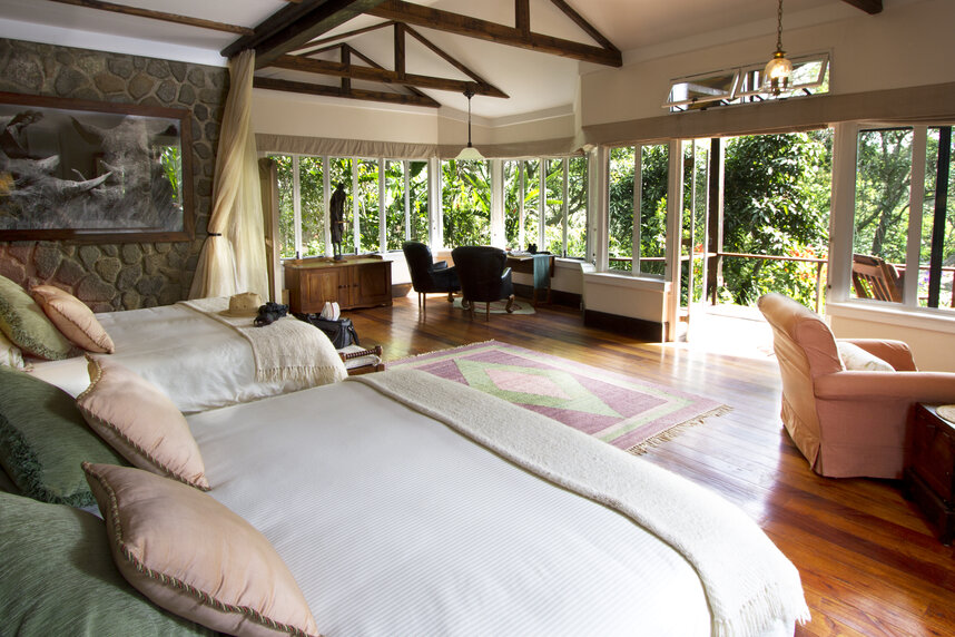 Alle 20 luxuriösen en-suite-Cottages verfügen über einen Safe, ein Moskitonetz, ein Badezimmer mit Badewanne und Dusche sowie Haartrockner. Handgefertigte Möbel und viel edles Eukalyptus-Holz betonen die Eigentümlichkeit der Gibb’s Farm. Von der Veranda haben Sie einen Ausblick auf den Garten und Kaffeeplantagen.