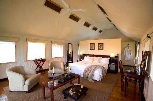 Sie wohnen in elf geräumigen und luxuriösen Zeltunterkünften mit hochwertiger Ausstattung und modernem Komfort. Die Zelte bieten eine gemütliche Sitzecke und verfügen über eine Veranda, auf der Sie die magischen Geräusche des Busches genießen können und einen traumhaften Blcik auf die Savanne haben.