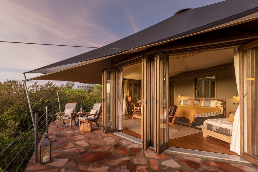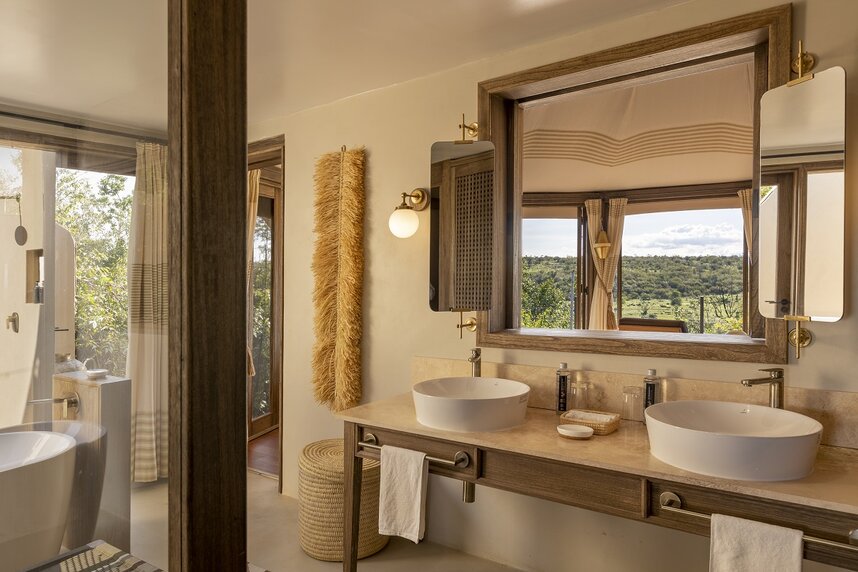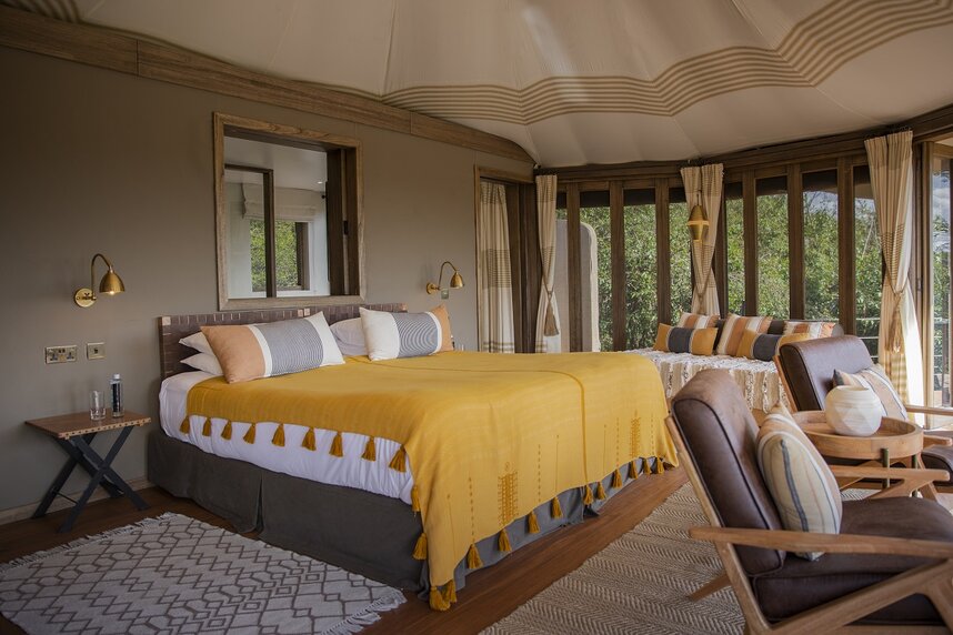 Die großzügigen runden Zelte von Ol Seki wirken dank der hellen Canvasstoffe leicht und luftig. Im kombinierten Lounge- und Schlafzimmer stehen breite Betten mit Moskitonetz, eine Couch, Lounge-Sessel und ein Schreibtisch. Rundherum ist die Canvasaußenwand mit großflächigen Gitternetzen unterbrochen, die aus jeder Position im Zelt einen herrlichen Blick über die Mara freigeben. Die Holzböden bedecken Perser- und Bastteppichen. In einem Nebenraum befindet sich das Bad mit begehbarer Dusche.