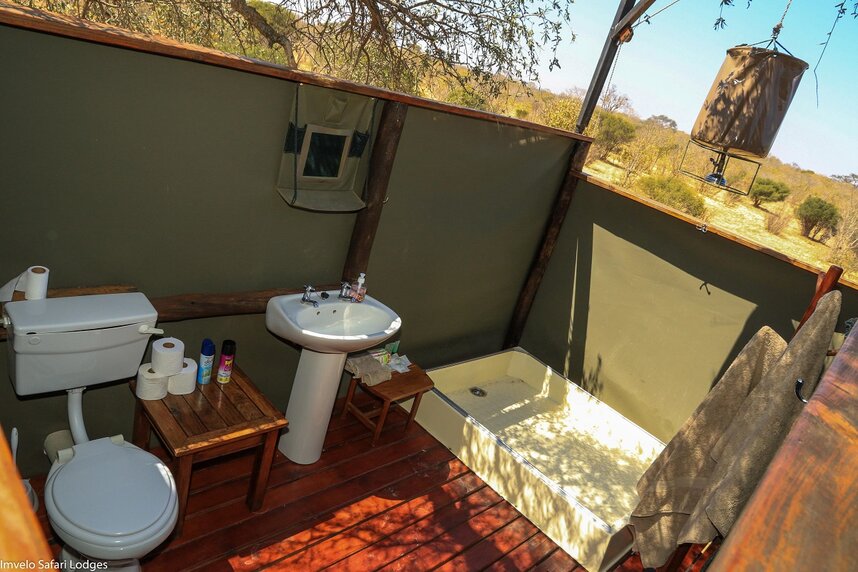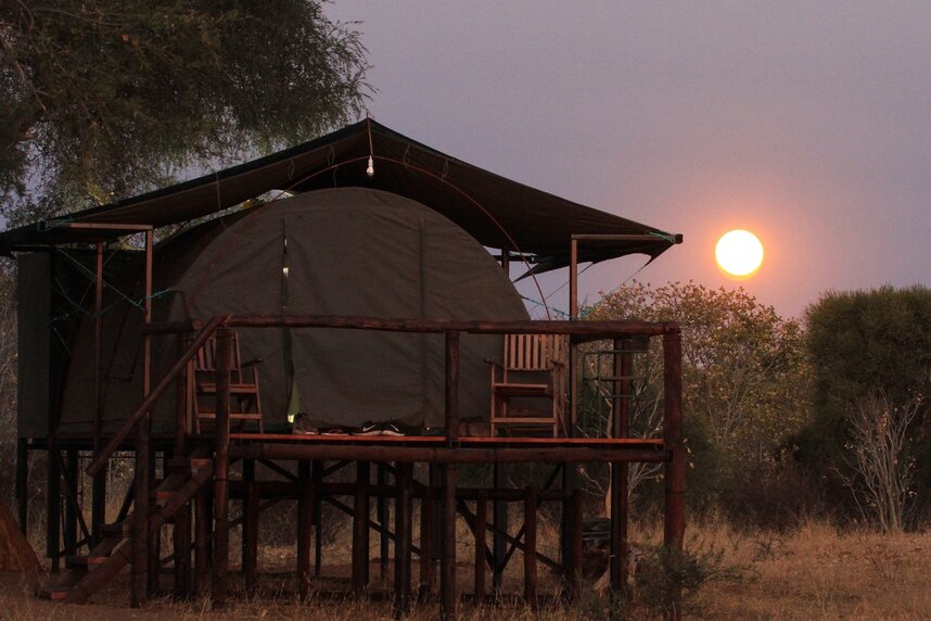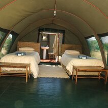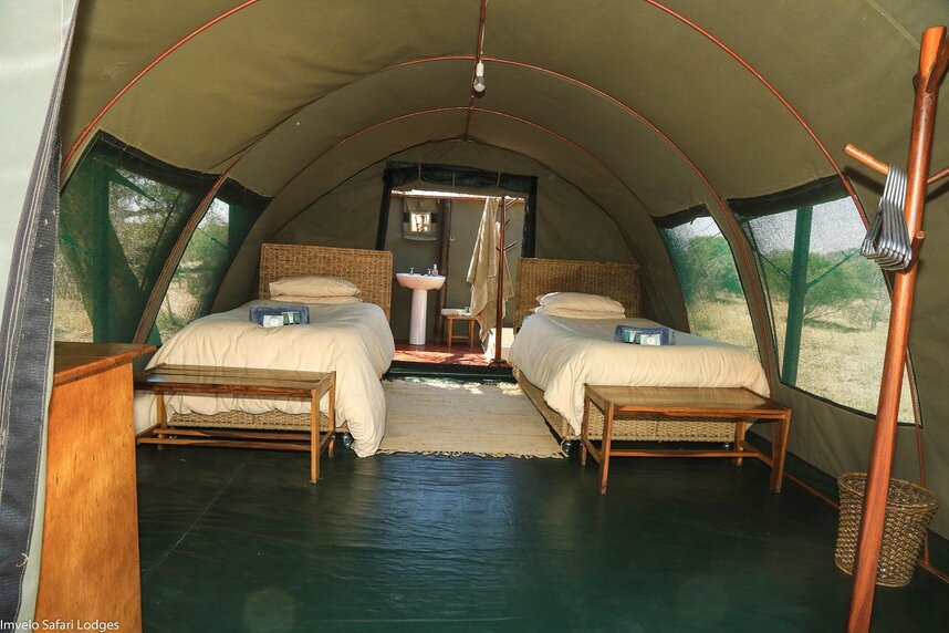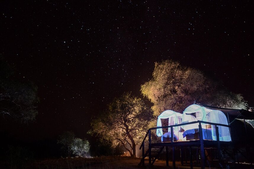 Das Camp hat insgesamt fünf 20m² große Doppelzimmerzelte auf erhöhten Plattformen mit Blick auf das campeigene Wasserloch errichtet. Die Zelte verfügen über ein Freiluft-Badezimmer mit einer Toilette sowie einer Eimerdusche. Alle Betten in den Zelten sind zudem mit Rädern ausgestattet, sodass Sie ihr Bett leicht auf das Zeltdeck schieben und eine Nacht unter den Sternen verbringen können.
