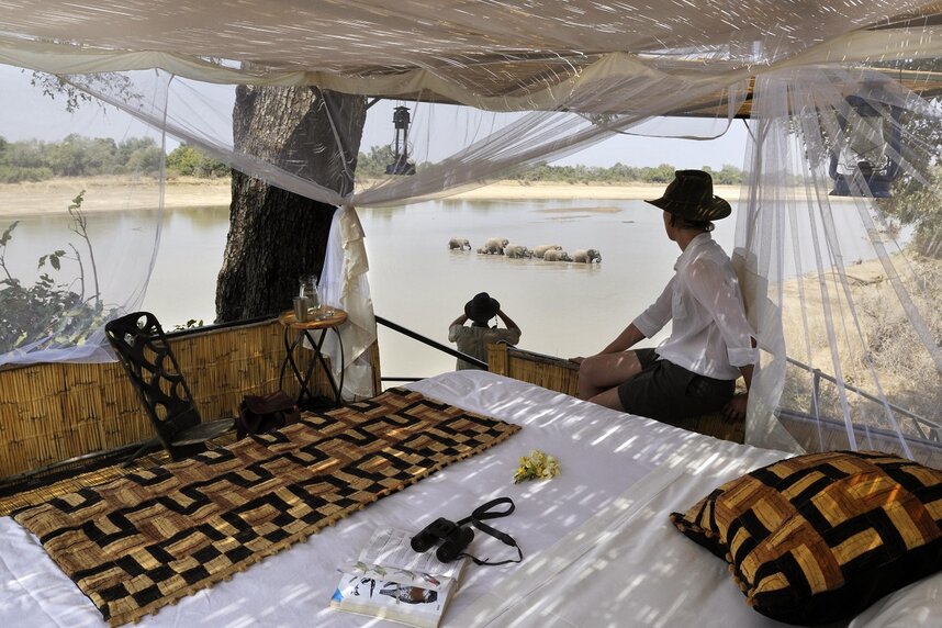 Das Kaingo Camp liegt bereits seit 1992 idyllisch eingebettet am Luangwa-Fluss und ist eines der letzten Camps im South Luangwa, welches sich in Familienbesitz befindet. Durch seine einfach gestaltete Art lädt das Camp direkt dazu ein sich im Busch wie zu Hause zu fühlen und die Umgebung auf sich wirken zu lassen. Damit Sie in der Unterkunft bereits ereignisreich in den Tag starten können wurde unten am Fluss vor dem Hauptgebäude ein Deck auf den Fluss hinaus gebaut, wo Sie Ihr Frühstück zu sich nehmen und die Tiere am Fluss beobachten können. Zudem ist das Camp von vielen offenen Flächen umgeben, so dass Sie mit hoher Wahrscheinlichkeit die dort lebenden Leoparden und Löwen von der Unterkunft aus bestaunen und hautnah erleben können. Ein weiteres absolutes Highlight des Camps bildet das Elephant Hide Star Bed - eine traumhafte Aussichtsplattform über dem Luangwa-Fluss, auf der Sie für eine Nacht gegen einen Aufpreis die Nacht verbringen können. Des Weiteren zählen zu den zentralen Einrichtungen des Camps eine Bar mit einer Lounge sowie eine kleine Bibliothek. Darüber hinaus haben Sie die Möglichkeit an Walking Safaris und Tages- und Nachtpirschfahrten teilzunehmen oder nach dem Lunch sich in einem der vielen Hides zu verstecken und die Tierwelt von nahem zu beobachten und zu fotografieren. Das Camp verfügt über einen Hippo Hide, sowie einen Bee-Eater Hide unten am Fluss und über einen Elephant Hide auf einem der Ebony Bäume.