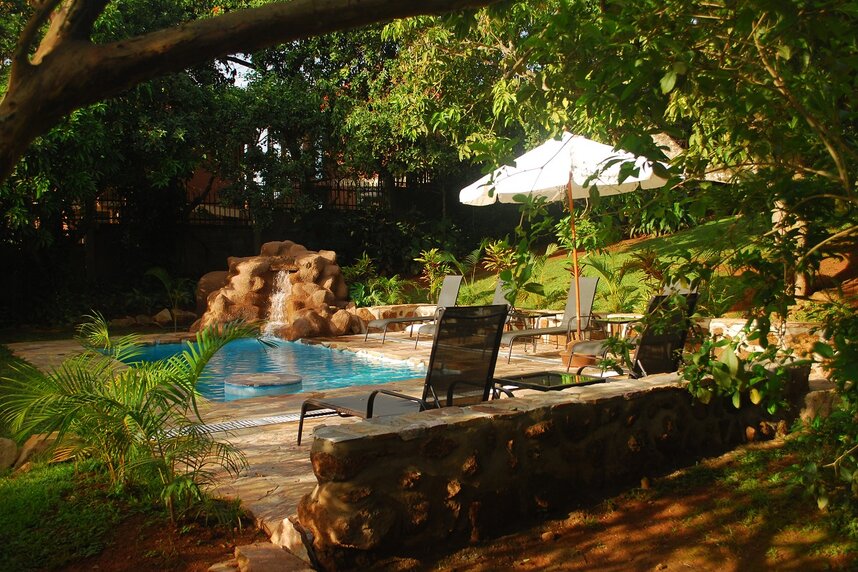 Nur 10 Fahrminuten vom internationalen Flughafen Entebbe entfernt liegt das Karibu Guesthouse. Hier wird ein hohes Maß an persönlichem Service geboten. Ausgezeichnete Mahlzeiten aus dem hoteleigenen Garten bieten ein kulinarisches Erlebnis vom Feinsten. Eine 24-Stunden-Rezeption, Swimmingpool, Spa- und Massageeinrichtungen und WLAN in allen Zimmern runden das umfangreiche Angebot ab. Der Swimmingpool ist eingebettet in den tropischen Garten des Hotels und umgeben von Palmen, Hibiscus, Avocado und Mangobäumen. Genießen Sie die Vogelwelt in den Gärten des Gästehauses - hier lassen sich an manchen Vormittagen über 40 Vogelarten beobachten! Machen Sie eine geführte Tour durch den Botanischen Garten von Entebbe, einen Ausflug zum Wildlife Education Centre, beobachten Sie den seltenen Schuhschnabelstorch in den Mbamba-Sümpfen, unternehmen Sie eine Bootsfahrt zum Schimpansenschutzgebiet auf Jane Goodalls Ngamba-Insel oder eine entspannende Sonnenuntergangskreuzfahrt auf dem Viktoriasee. Das Boutique-Hotel lässt an Aktivitäten kaum einen Wunsch offen.