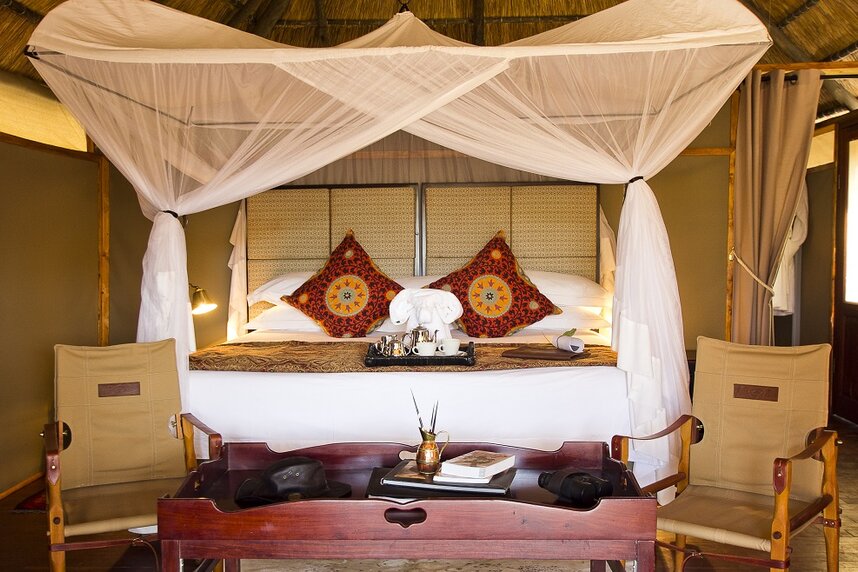 Das Camp umfasst 6 maßgeschneiderte, reetgedeckte Suiten im Safaristil, die auf Plattformen gebaut wurden. Jede Einheit hat eine Innen- und eine Außendusche und eine Terrasse mit Schaukelstühlen für entspannte Wildtierbeobachtungen.