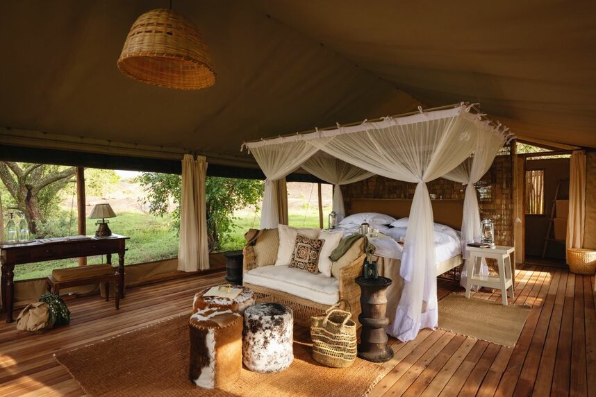 Das Camp verfügt über zwölf offene sehr exklusive Zelte mit privater Dusche / WC und einer Veranda vor dem Zelt, welche sich als idealer Ort zum Entspannen bei einem Sundowner eignet. Die Zelte werden durch Akazienbäume vor der Sonne geschützt und bestechen durch Ihren sehr geräumigen Schnitt. Da die Unterkünfte alle einen Blick auf den Busch haben bietet sich das Zelt als perfektes Versteck für gelegentliche Wildbeobachtungen.