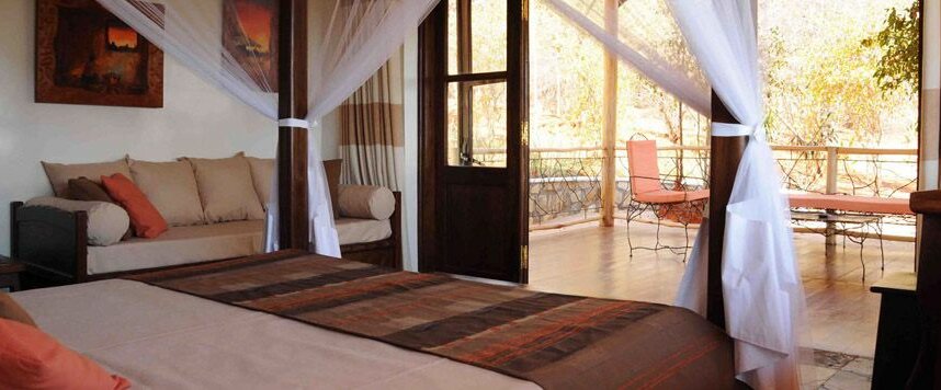 Die 17 Bungalows (55m²) der Lodge sind mit einer charmanten, rustikalen Einrichtung ausgestattet. Die traditionellen Holzschnitzereien und Metallverzierungen wurden von lokalen Künstlern und Handwerkern geformt. und bieten eine Sitzecke, Bad mit Dusche sowie eine große möblierte Terrasse mit einem außergewöhnlichen Ausblick.