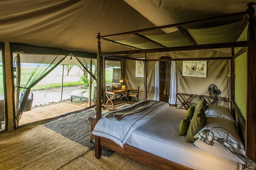 Alle Zelte sind im traditionellen Safaristil gebaut und ausgestattet mit Außendusche und möblierter Veranda.