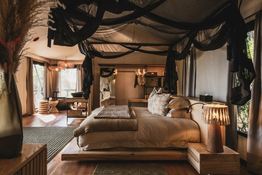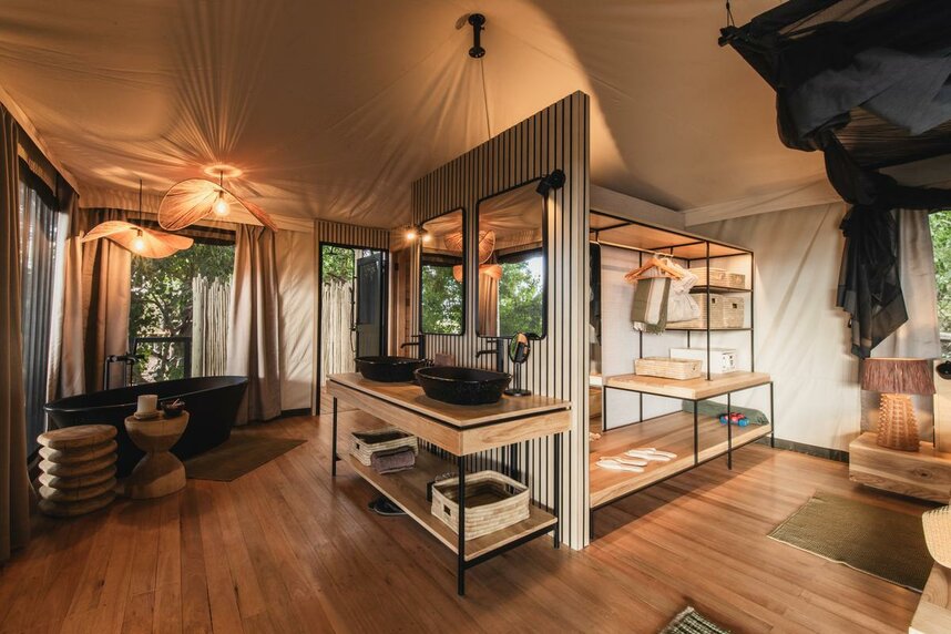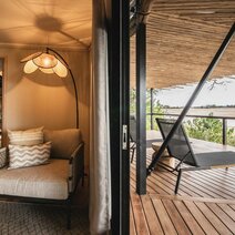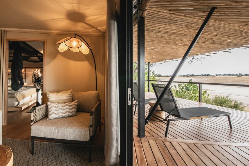 Das Camp verfügt lediglich über drei komfortable Safari-Zelte für insgesamt maximal sechs Gäste. Die Wohneinheiten sind klassisch-modern in freundlichen Tönen eingerichtet und bieten mit eigener Veranda einen traumhaften Blick auf das Delta.