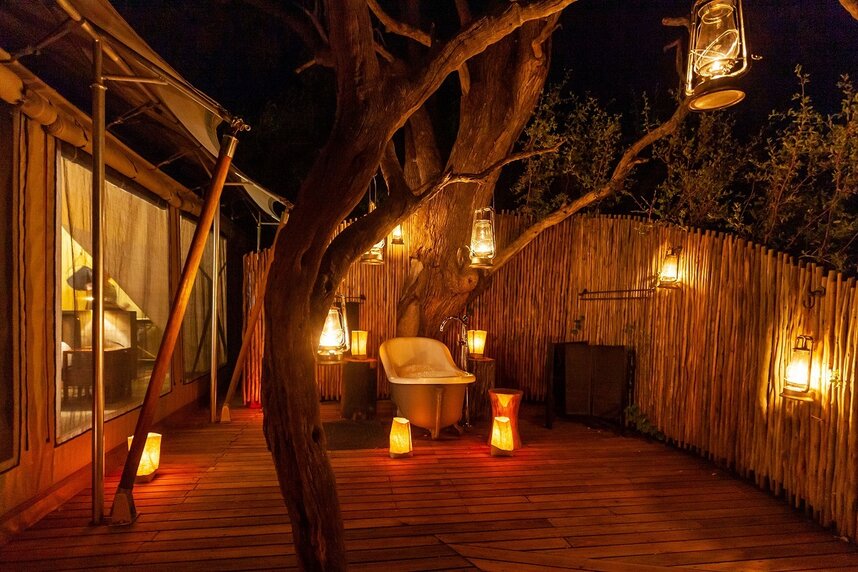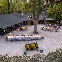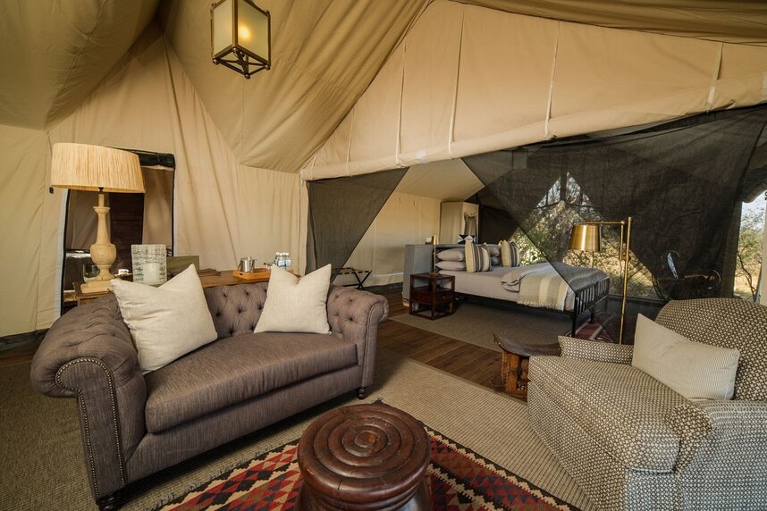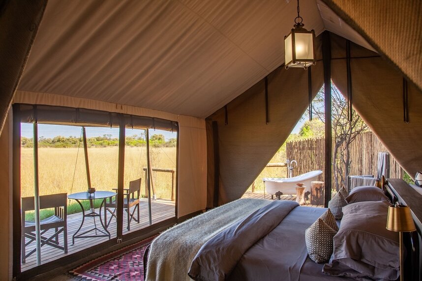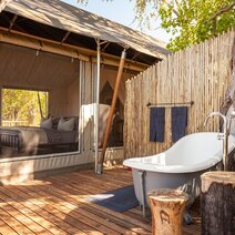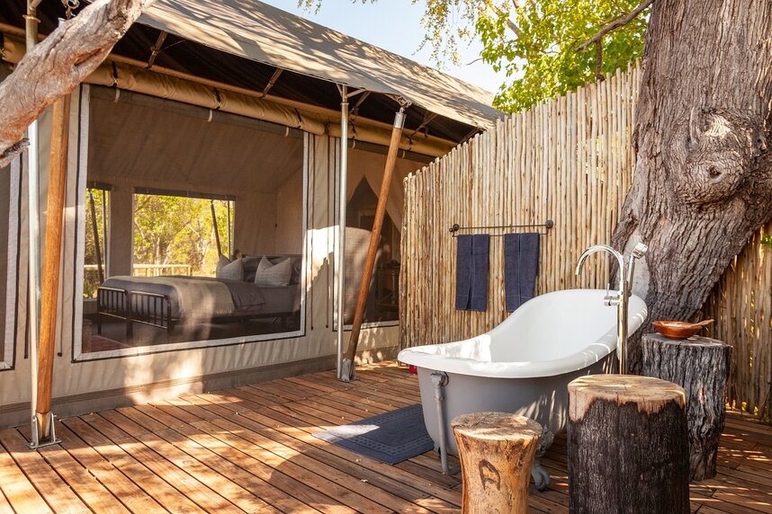 Den Gästen stehen acht Luxus-Zelte und zwei Luxus-Familienzelte zur Verfügung und alle im klassischen Safari-Stil der 1950er Jahre erbaut. Genießen Sie direkt von Ihrer eigenen Veranda die Tiere, die oftmals zum Trinken an den Fluss kommen. Die Einrichtung ist sehr komfortabel, das Badezimmer verfügt über eine Innen- und Außendusche.