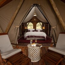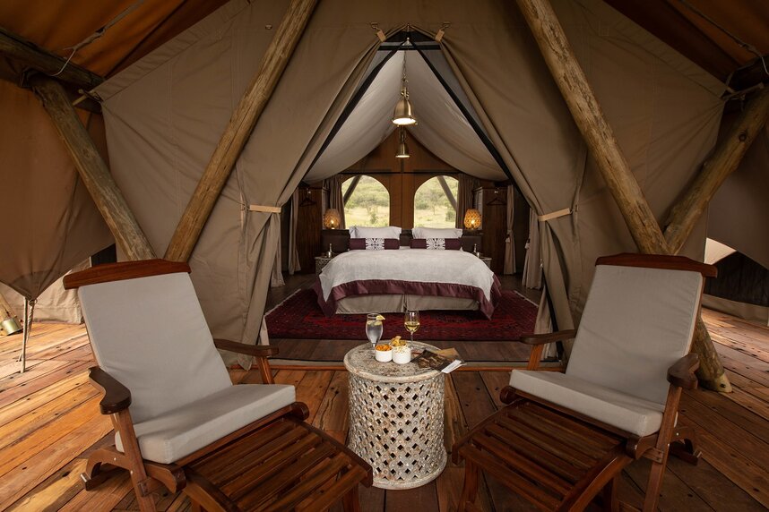 Die vier Zelt-Suiten verstecken sich in den Baumkronen der Akazien und verfügen über ein en-suite Badezimmer und einen Loungebereich, sowie eine Veranda, von der Sie die traumhafte Kulisse der Masai Steppe genießen können. Für Familien steht ein eigenes Familienzelt mit zwei Schlafzimmern zur Verfügung, Kinder sind ab 8 Jahren erlaubt.