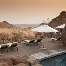 In endloser, unberührter Wildnis mit faszinierender Wüstenlandschaft liegt das Mowani Mountain Camp, das 2021 neu renoviert wurde. Durch die etwas erhöhte Lage genießen Sie einen sehr guten Ausblick über die uralte Landschaft mit ihrer ausgeprägten Wüstenflora und -fauna. Das Aba-Huab-Tal in der Nähe des Camps ist Lebensraum der Wüstenelefanten und bietet guten Chancen, diesen Tieren im Rahmen einer geführten Pirschfahrt zu begegnen. Im eleganten Haupthaus befinden sich Rezeption, Bar, Speisebereich sowie eine Lounge mit Sicht auf ein Wasserloch. Entspannung finden Sie am Felsenpool mit Wasserfall und Sonnendeck oder abends an der Boma. Das Mowani Mountain Camp hat außerdem den wohl schönsten Sundowner-Platz Namibias zu bieten. Oberhalb Mowanis ist eine Bar auf einer großen Felsenkuppe eingerichtet, von wo aus Sie beobachten können wie sich langsam die Hügelwelt um Sie herum purpurrot verfärbt und die Sonne hinter den Vulkangebirge des Damaralandes verschwindet.