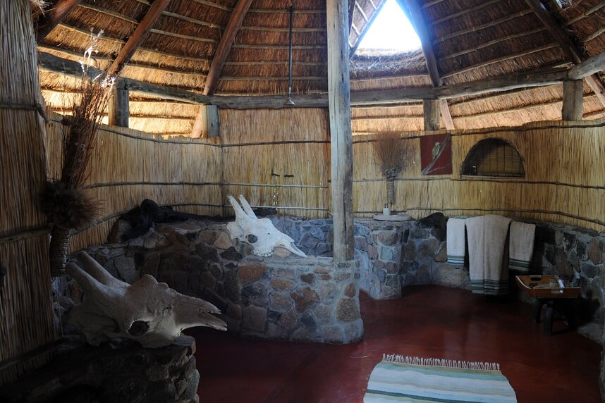 Die 13 aus natürlichen Materialien erbauten Chalets harmonieren mit der Umgebung. Sie sind geräumig, mit Reet gedeckt und verfügen über ein Bad mit Dusche sowie eine gemütlich möblierte Veranda mit Blick auf das Flussbett.