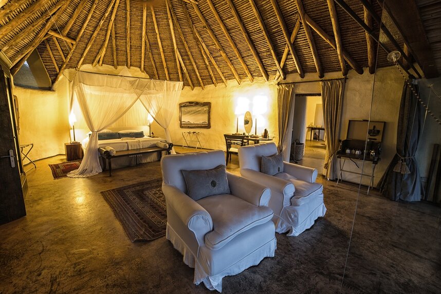 Die Lodge verfügt über zehn große Suiten, die in sechs freistehenden Villen untergebracht sind. Alle Suiten sind individuell gestaltet und haben ein großes Bad mit Außendusche, Veranda und "Star-Bed", um im Freien schlafen zu können. Zusätzlich verfügen die Suiten über deckenhohe Glastüren vor dem Schlafbereich, die einen umwerfenden Blick nach draußen ermöglichen. Die Villa "Sambu" besteht aus zwei getrennten Suiten mit gemeinsamer Lounge und einem geteilten Swimming Pool und ist ideal für Familien.