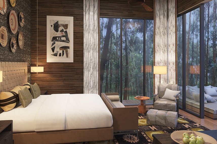 Die 43 Zimmer sind individuell eingerichtet und verfügen über eine traumhafte Aussicht in den Volcanoes Nationalpark, dem ältesten Nationalpark Afrikas.
