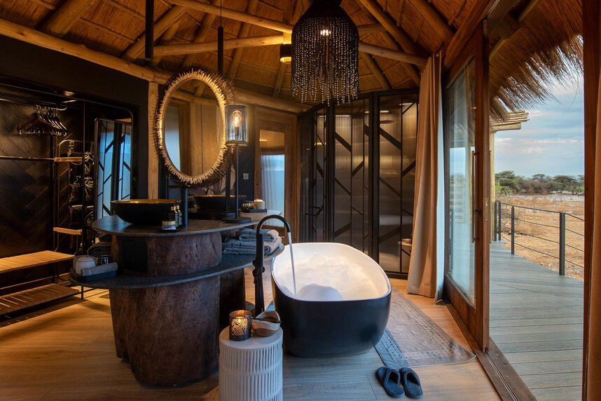 Ein Spa-Behandlungsraum mit herrlichen Massagen, ein Fitnessraum, ein Yogadeck und ein Hide direkt am Wasserloch zur Tierfotografie runden die großartigen Annehmlichkeiten des Onguma Camp Kala ab.