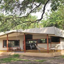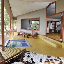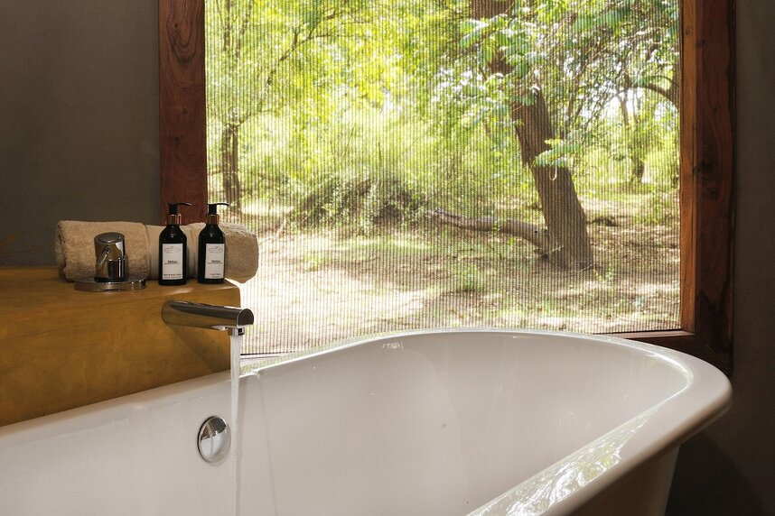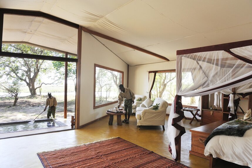 Hier erwarten Sie drei geräumige Zelte mit Dusche, Badewanne und einer Terrasse mit Plunge Pool. Zusätzlich gibt es ein Zelt mit zwei Schlafzimmern, welches sich besonders gut für Familien oder zwei Paare, die zusammen verreisen eignet. Denn bei diesem Zelt verfügt jedes Schlafzimmer über sein eigenes privates en-suite Badezimmer mit zwei separaten Waschbecken und Duschen sowie einer Badewanne, wo Sie die Aussicht besonders genießen können. Zudem bietet auch dieses Zelt einen Plunge Pool und ist mit einem Kühlschrank und einem privaten Esstisch und Möbeln ausgestattet. Alle Zelteinheiten stehen unter Schattenspendenden Akazien und Mahagoni-Bäumen und wurden auf hölzernen erhöhten Plattformen errichtet, die über ebenfalls erhöhte Stege zu erreichen sind. Darüber hinaus verfügt jedes Zelt über eine eigene kleine Veranda mit einer Hängematte, wo Sie sich entspannen und vom Tage ausruhen können.