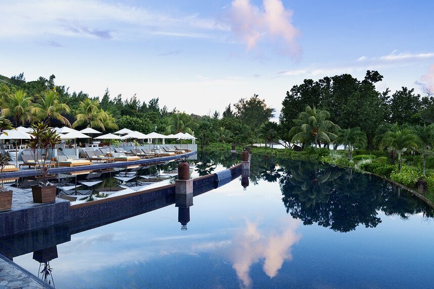 Eingebettet in die zeitlose, tropische Schönheit der Insel Praslin liegt das luxuriöse Raffles Seychelles direkt am 500 m langen Traumstrand der Anse Takamaka. Dominiert wird die Landschaft dieser bezaubernden Bucht von immergrüner Vegetation, pittoresken Felsformationen und kristallklarem Wasser – ein Anblick, der das ultimative Paradies zu definieren scheint. Durch seine Hanglage garantiert das Raffles seinen Gästen einen Panoramablick auf die atemberaubende Szenerie und versäumt es nicht, diese natürlichen Gegebenheiten mit einer Hotelanlage der Superlative zu ehren. Erzählt man die Geschichte der ikonischen Marke Raffles, die einst im Jahr 1887 in Singapur begann, erzählt man auch eine Geschichte feinster Kulinarik, die auch das Raffles Seychelles mit Stolz weitererzählt. Das Hauptrestaurant "Losean" begeistert mit internationaler Küche, im "Curieuse" werden indische sowie asiatische Spezialitäten kredenzt und das "Pool Restaurant" ist der richtige Ort für knackige Salate und Sushi. Lassen Sie Ihren Tag stilvoll bei einer Wasserpfeife oder einem Cocktail auf der Dachterrasse "Takamaka Terrace" ausklingen – der Panoramablick ist einfach magisch. Ein besonderes Highlight ist auch das edle "Raffles Spa" mit seinen 12 Behandlungsräumen. Aktive Gäste können das Fitnesscenter nutzen oder verschiedene Wassersportaktivitäten entdecken.