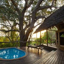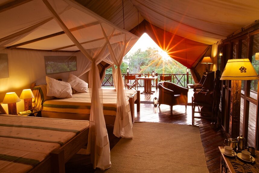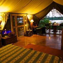 Entlang des Ufers stehen 11 komfortable Zelte mit Reetdach, Dusche, Spültoilette und großer Veranda. Von dieser können Sie bequem das Geschehen am Fluss beobachten. Ergänzt werden die Zelte durch drei größere Suiten mit je zwei Schlafzelten und kleinem Privatpool auf dem gemeinsamen Aussichtsdeck – ideal für Freunde oder Familien auf der Suche nach luxuriösem Privaturlaub.