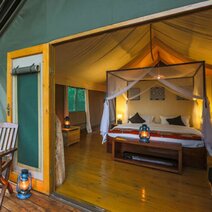 Die 9 Zelte, davon 7 Classic-Zelte, 1 Honeymoonzelt und 1 Familienzelt, sind von den ruhigen Ufern entfernt und zwischen Palmen und Feigenbäumen versteckt. Eine zentrale Feuerstelle ist der perfekte Ort für einen Morgenkaffee oder einen abendlichen Drink unter den Sternen. Ruzizi bietet Platz für 20 Gäste und ist ein privater, komfortabler Rückzugsort. Alle Zelte sind mit eigenem Bad ausgestattet und verfügen über schattige Verandas mit Stühlen und einem Baumstammtisch. Die umweltbewusste Lodge wurde so konzipiert, dass sie sich in die Umgebung einfügt, damit die Gäste mit der Natur in Kontakt treten können, und wird mit Solarenergie betrieben. Einige natürliche Elemente wurden in die Struktur integriert, und ein Großteil des Dekors und der Möbel wurde von lokalen Handwerkern und Kooperativen handgefertigt. Die Gewinne aus dem Ruzizi, das vom Park entworfen, gebaut und vollständig betrieben wird, kommen den Naturschutzinitiativen in Akagera zugute.