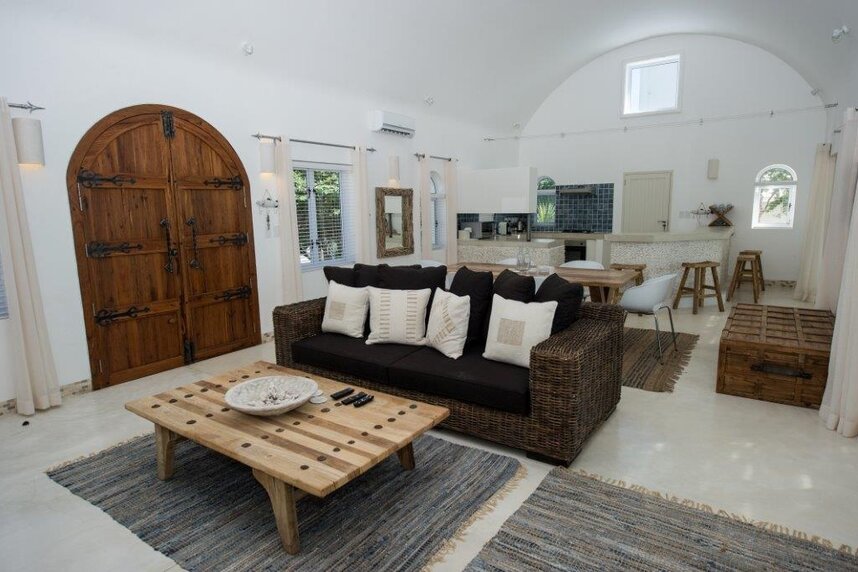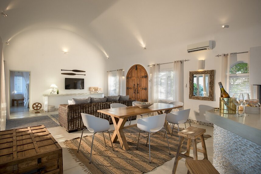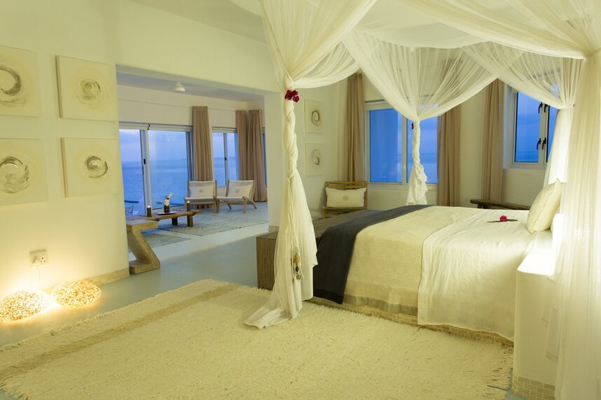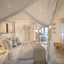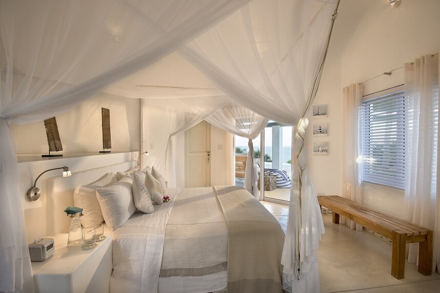 Die fünf Villa Suiten mit Meerblick sind exklusiv ausgestattet mit privater Terrasse. Alle Zimmer tragen unterschiedliche Namen, sind mit einem Kingsize-Bett ausgestattet und blicken auf den Indischen Ozean. WLAN und Satellitenfernsehen sind ebenfalls verfügbar. Santorini Mozambique bietet darüberhinaus zwei Villen zur Exklusivnutzung an.