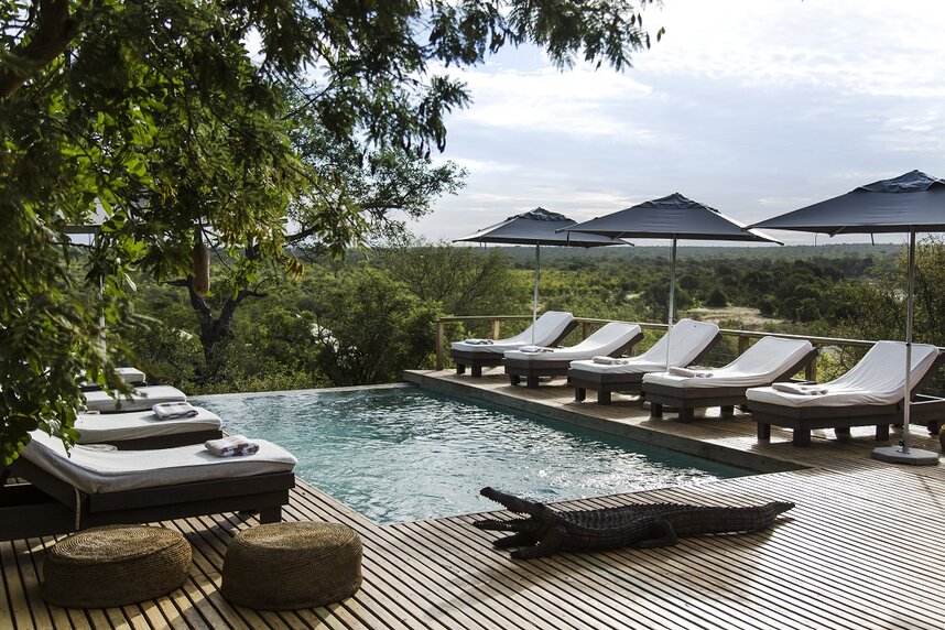 Die luxuriöse Simbavati Hilltop Lodge ist auf Stelzen gebaut und bietet eine spektakuläre 360-Grad-Aussicht über den Busch. An heißen Tagen finden Sie Abkühlung im Infinity-Pool und entspannen Sie sich auf den bequemen Liegen auf der Veranda mit wunderbarem Blick auf den Fluss, an dessen Ufer regelmäßig Tiere beobachtet werden können. Zur Lodge gehören außerdem eine großzügige Lounge mit kleiner Bibliothek, eine Bar und ein Souvenirgeschäft. Die Safarifahrzeuge werden mit maximal sechs Personen belegt, sodass ein Fensterplatz garantiert ist. Nach einem langen und aufregenden Tag auf Safari können Sie abends die hervorragenden afrikanischen Köstlichkeiten genießen, die Ihnen bei geeignetem Wetter unter freiem Himmel serviert werden.