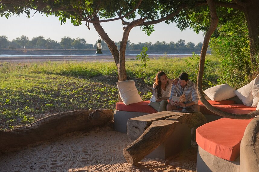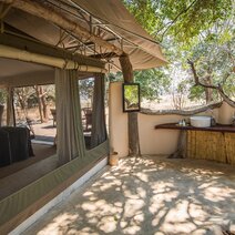 Die sechs Zelte sind mit großem Abstand zueinander aufgebaut und gewähren ein Höchstmaß an Privatsphäre; von jedem aus öffnet sich die Sicht auf einen wunderschönen Abschnitt des Flusslaufs, an dem sich Nilpferde suhlen und man Löwen brüllen hört. Die geräumigen en-suite-Bad öffnen sich nach außen und nehmen die natürlichen Gegebenheiten geschickt auf, indem sie die Bäume in die Architektur integrieren und das Farbspiel der Umgebung kopieren. Die Zelte sind so angeordnet, dass sie dem Gast allseits Zurückgezogenheit gönnen, im Schlafraum, im Bad und auf der Terrasse mit ihrer einladenden Sitzgruppe.
