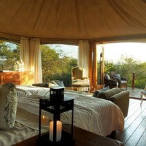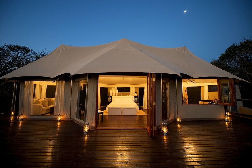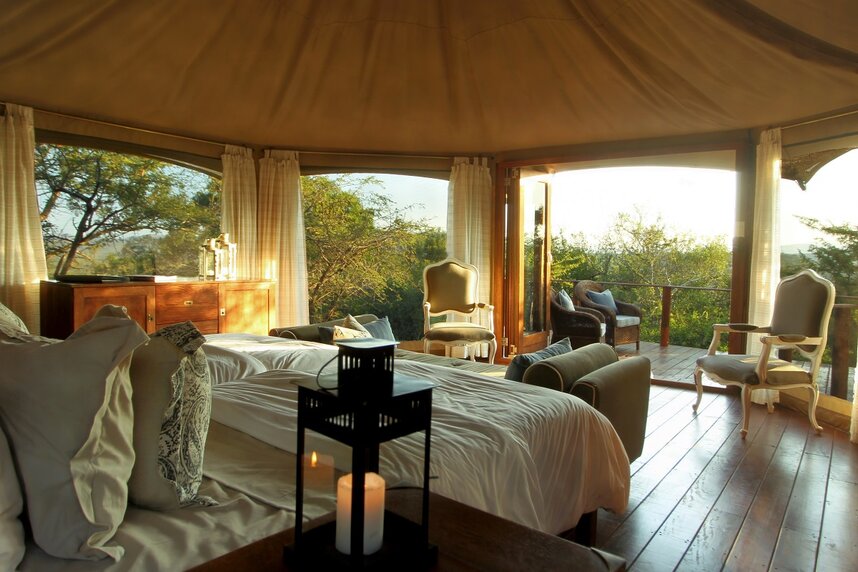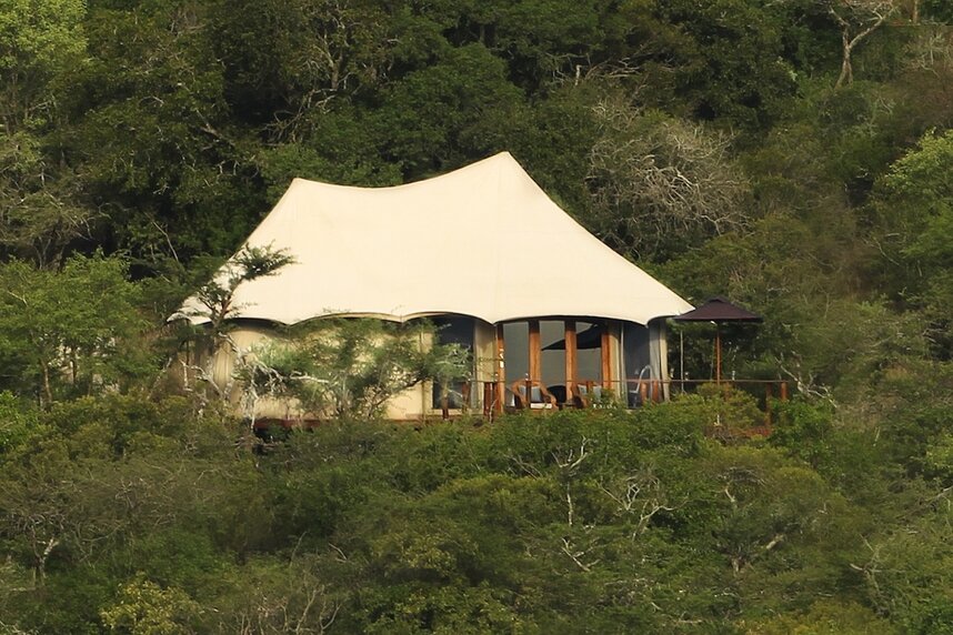 Die 15 Zelte im "Hemingway Stil" sind weit verteilt auf einem Berg und bieten viel Privatsphäre und einen traumhaften Ausblick. Jedes der Zelte hat ein privates Sonnendeck und ein Badezimmer mit Badewanne und teilweise einer Außendusche. Es gibt keine Elektrizität in den Zelten.