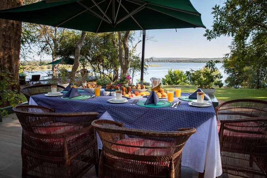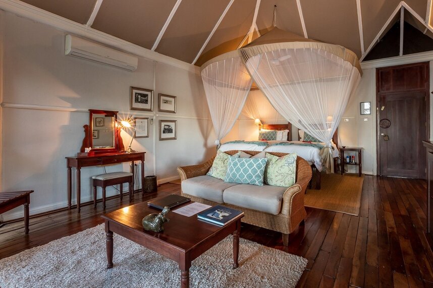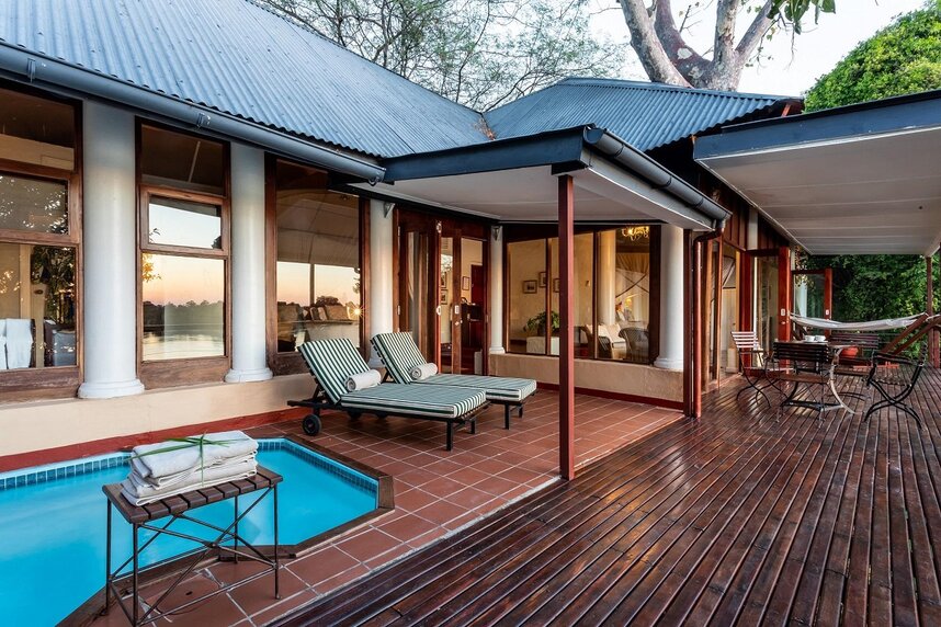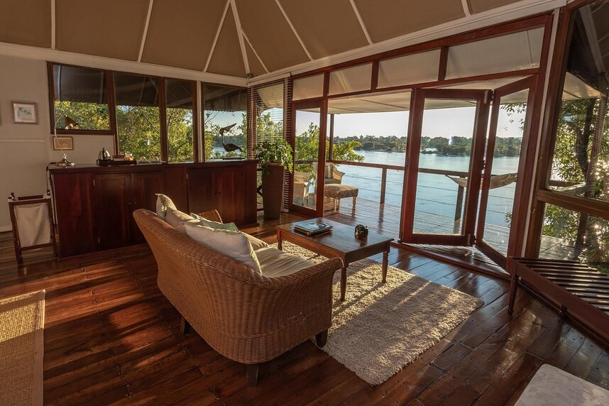 The River Club verfügt über insgesamt 11 geräumige, private mit Reetdächern gedeckte Suiten, welche in einem großen Garten einzeln in die Baumgrenze entlang des Zambezi Flusses eingebettet sind. Die Suiten wurden offen gestaltet und geschmackvoll mit Möbeln aus schönem Sambesi-Teakholz dekoriert. Unterteilt wurden die Suiten in vier Kategorien, darunter sind sieben River Suiten, zwei Luxury River Suiten, eine Luxury River Family Suite und eine Princes Mary Suite. Die River Suiten bieten Platz für zwei Personen und verfügen über zwei voll ausgestattete Badezimmer mit einer Badewanne und einer Dusche. Zudem sind die Suiten nach Westen ausgerichtet und von einem Privaten Deck umgeben, damit Sie die spektakulären afrikanischen Sonnenuntergänge genießen und abschalten können. Die Luxury River Suiten bieten ebenfalls Platz für zwei Personen und verfügen zudem über einen kleinen privaten Plunge Pool, welcher zur Entspannung einlädt. Die etwas größere Luxury River Family Suite bietet dieselbe Ausstattung wie die Luxury River Suiten und Platz für bis zu fünf Gäste, da hier zwei separate Schlafzimmer vorhanden sind. Den meisten Platz bietet die doppelstöckige Princes Mary Suite. Hier können bis zu sechs Personen übernachten. Im oberen Stockwerk der Suite befindet sich ein Doppelzimmer mit Balkon, der zum Zambezi Fluss ausgerichtet ist. In der unteren Etage befindet sich das zweite Schlafzimmer mit zwei Einzelbetten sowie ein geräumiger Wohn-/Essbereich. Abgerundet wird das Arrangement mit einem abgeschiedenen privaten Garten mit Pool, wo Sie Ihre Privatsphäre und die Ruhe genießen können.