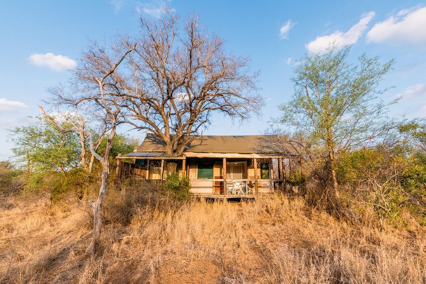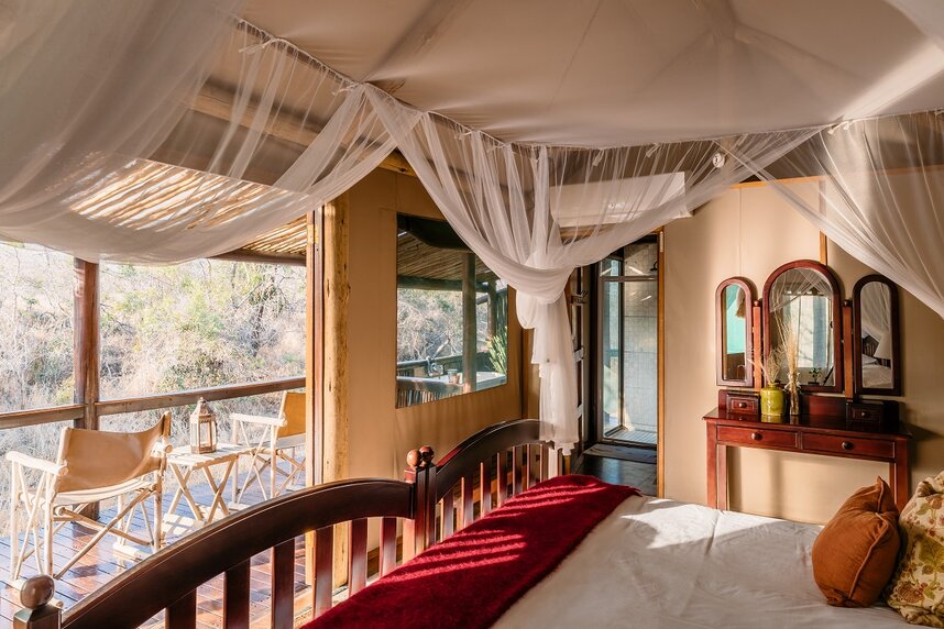 Jedes, der acht Zelte steht auf einem erhöhten Holzdeck und bietet Ausblick auf die Ebene. Die Zeltwände lassen den Ruf der Natur und des Busches eindringen und ermöglichen Ihnen ein intensives Safari Erlebnis. Ein Scheinwerferlicht ermöglicht rund um die Uhr den Blick in die Natur und sogar das Badezimmer ist zu einem Deck mit einer großen Badewanne hin geöffnet. Sollten Sie genug afrikanische Sonne getankt haben, können Sie die Abendbeobachtungen klimatisiert durch verglaste Türen fortsetzen. Große King-Size-Betten empfangen Sie nach den Abenteuern des Tages.