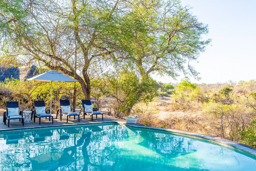 Der Hauptbereich überblickt ein Wasserloch und ein Flussbett, die häufig von Elefanten, Büffeln und anderen Großwildarten besucht werden. Genießen Sie die Natur und erholen Sie sich zwischen den Pirschfahrten am Swimmingpool der Lodge.