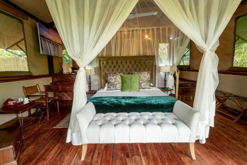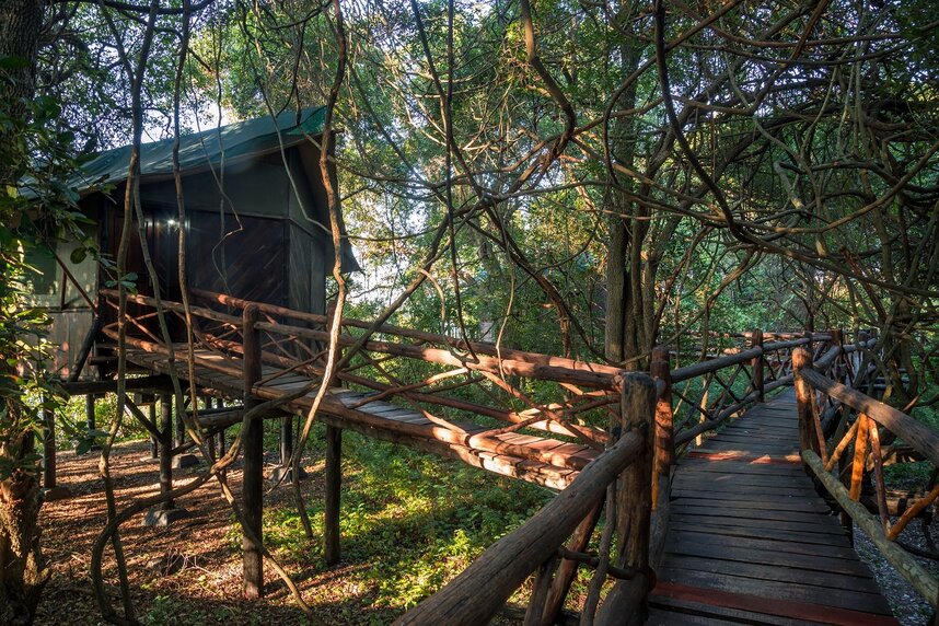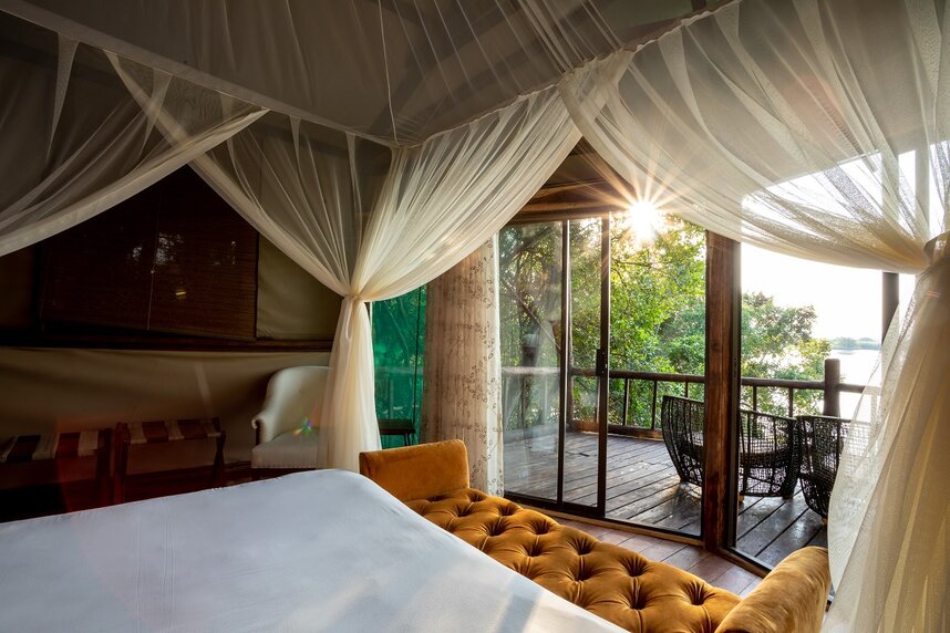 Die sieben einzigartigen Tented Treehouses sind mit Badezimmern im viktorianischen Stil ausgestattet. Sie beinhalten eine Badewanne und eine Dusche. Vom Bett aus haben Sie eine beeindruckende Aussicht über den Balkon auf den Zambezi.